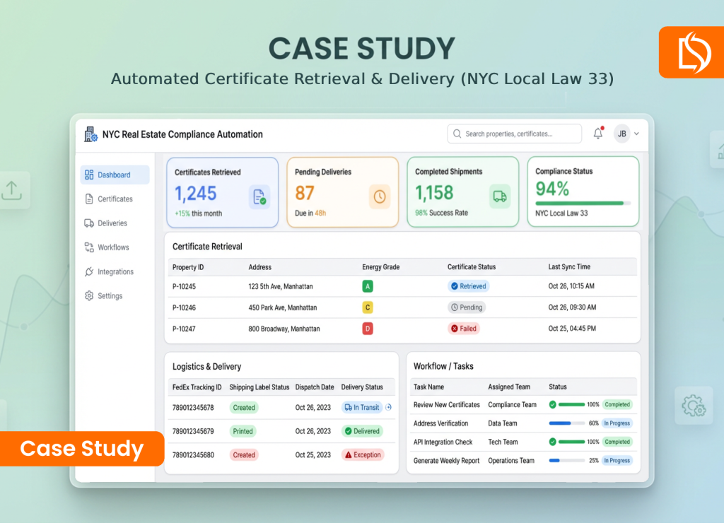 Real Estate Automated Certificate Retrieval & Delivery (NYC Local Law 33) Discover how we eliminated manual ‘click & print’ workflows…